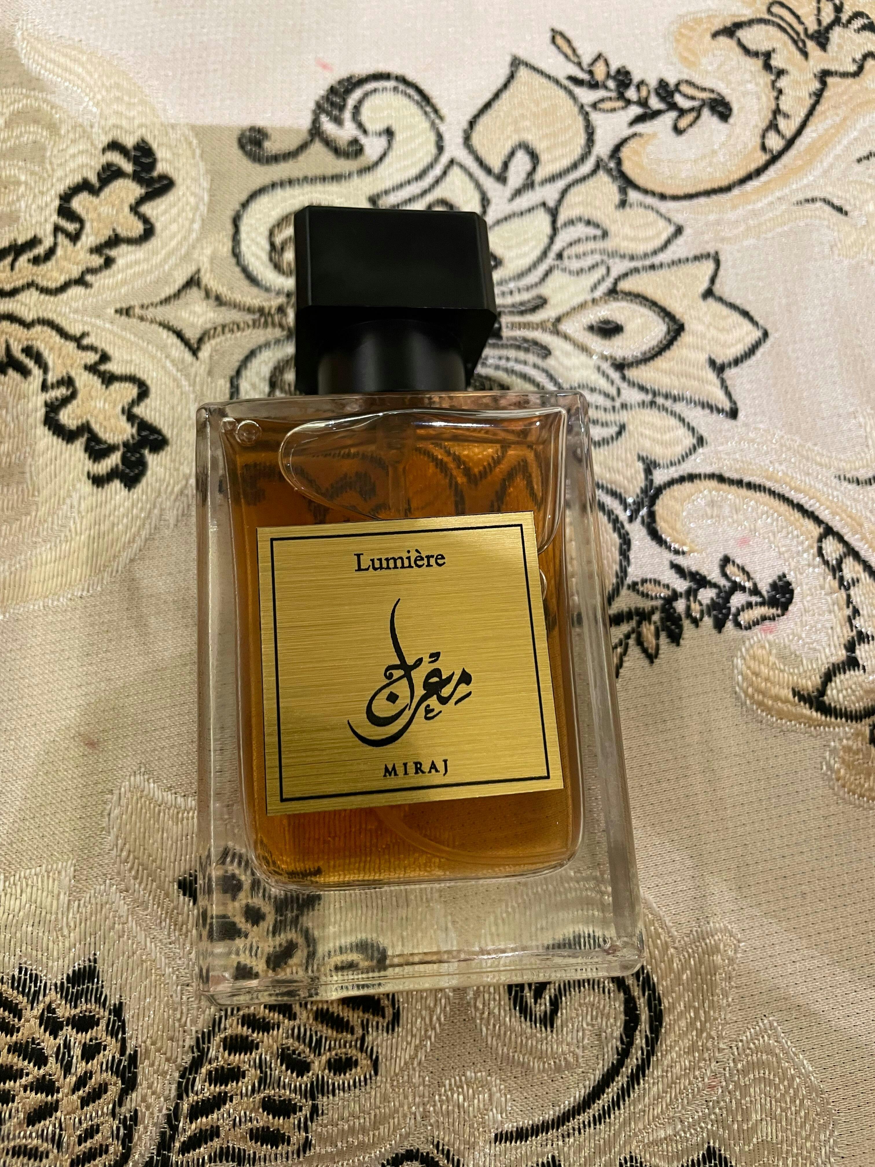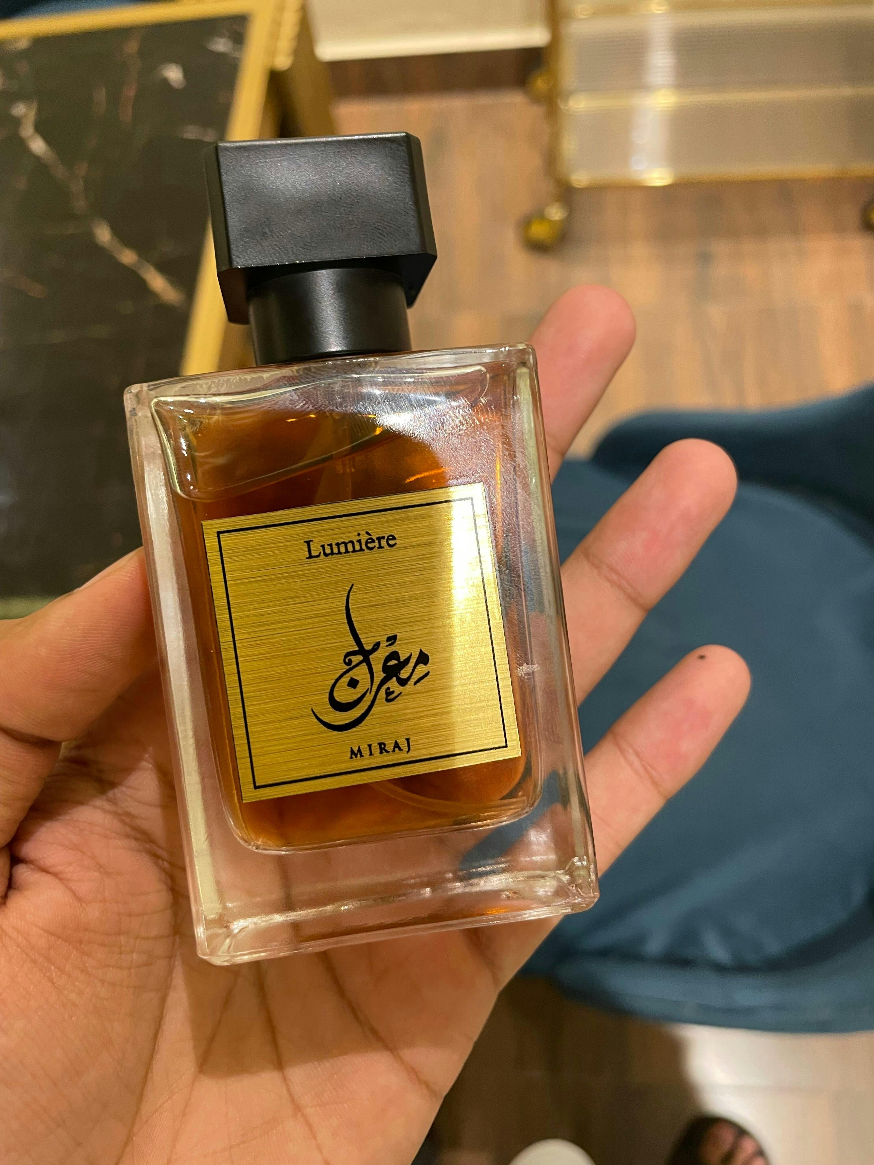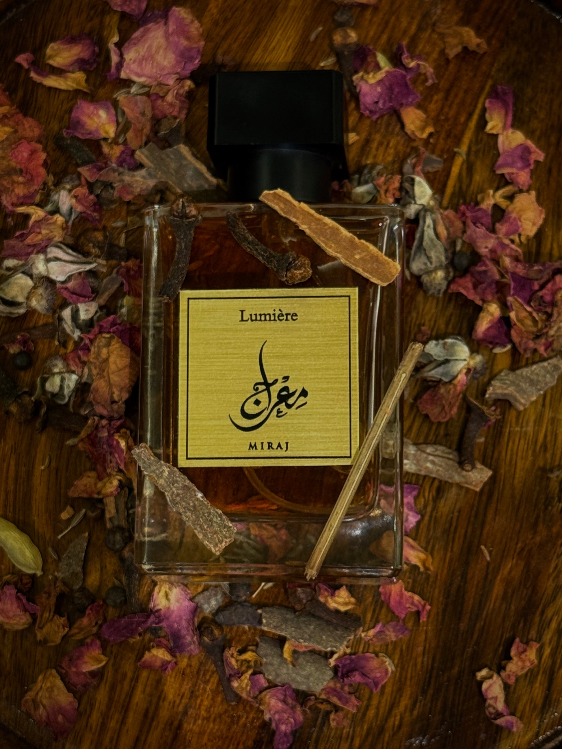 Miraj is the embodiment of masculine strength — a fragrance that ascends with power, purpose, and allure. It opens with an electrifying blend of black saffron, grapefruit zest, and smoked cardamom, setting an unmistakably bold tone. At its heart, oud wood, patchouli, and cypress unfold — deep, earthy, and resolute. As it settles, amber, leather, and dark musk create a lasting trail that speaks of confidence and command.