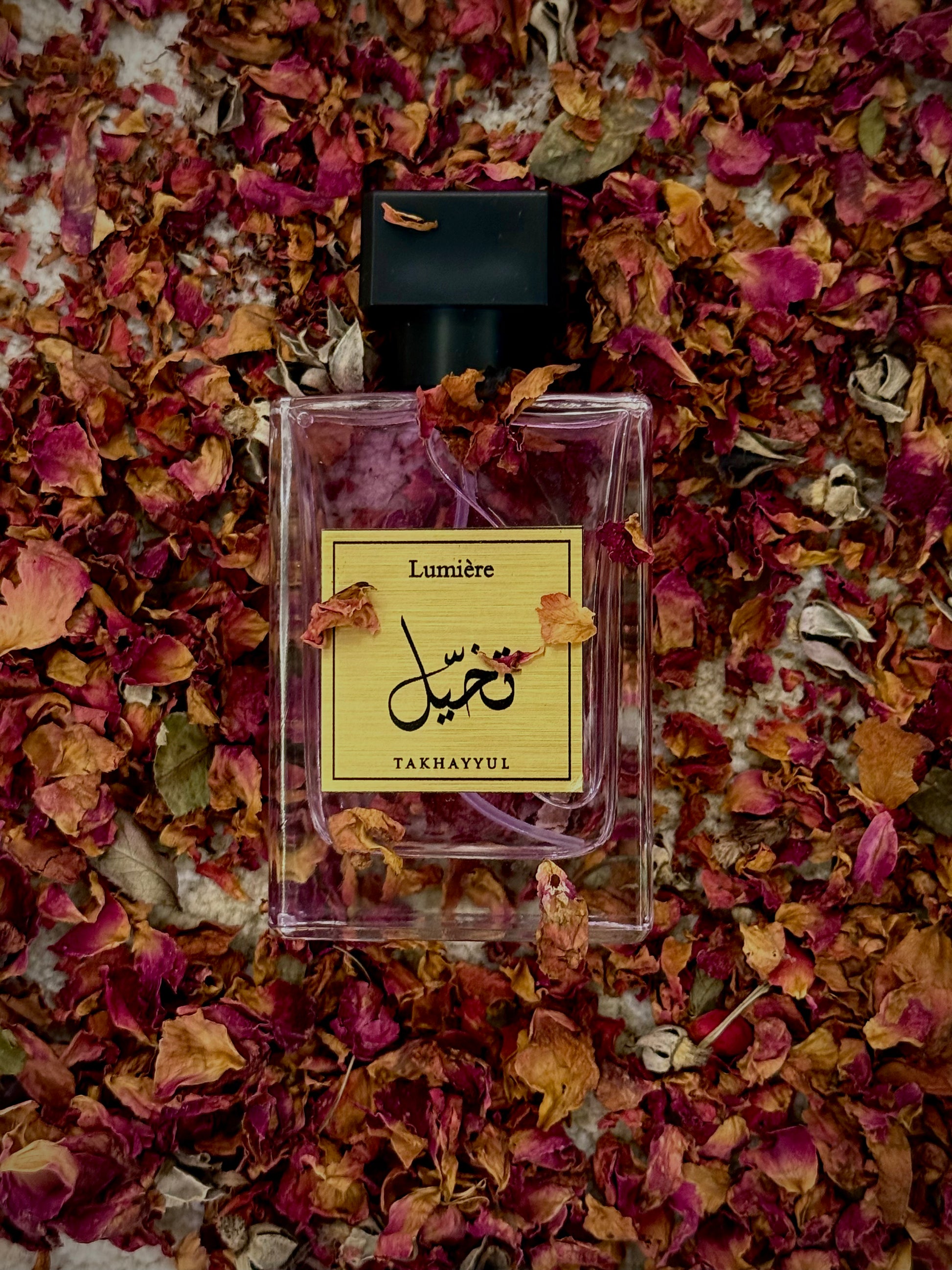 Takhayyul is a journey through imagination — a fragrance that blurs the line between reality and fantasy. It opens with a luminous blend of saffron and bergamot, sparkling like golden light at dawn. The heart reveals the sensual grace of damask rose and white jasmine, entwined with the warmth of honeyed amber. As it settles, a base of oud, vanilla, and musk wraps the skin in an aura of mystery and timeless beauty.